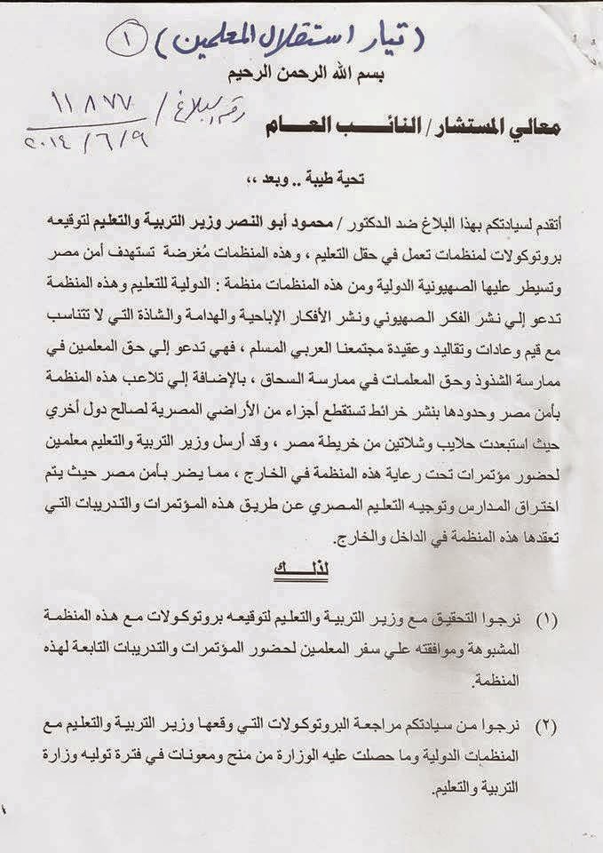 تقدم "تيار استقلال المعلمين" ببلاغ للنائب العام ضد الدكتور محمود أبو النصر وزير التربية والتعليم بحكومة الانقلاب لتوقيعه بروتوكولات مع منظمات تعمل فى حقل التعليم تسيطر عليها الصهيونية.