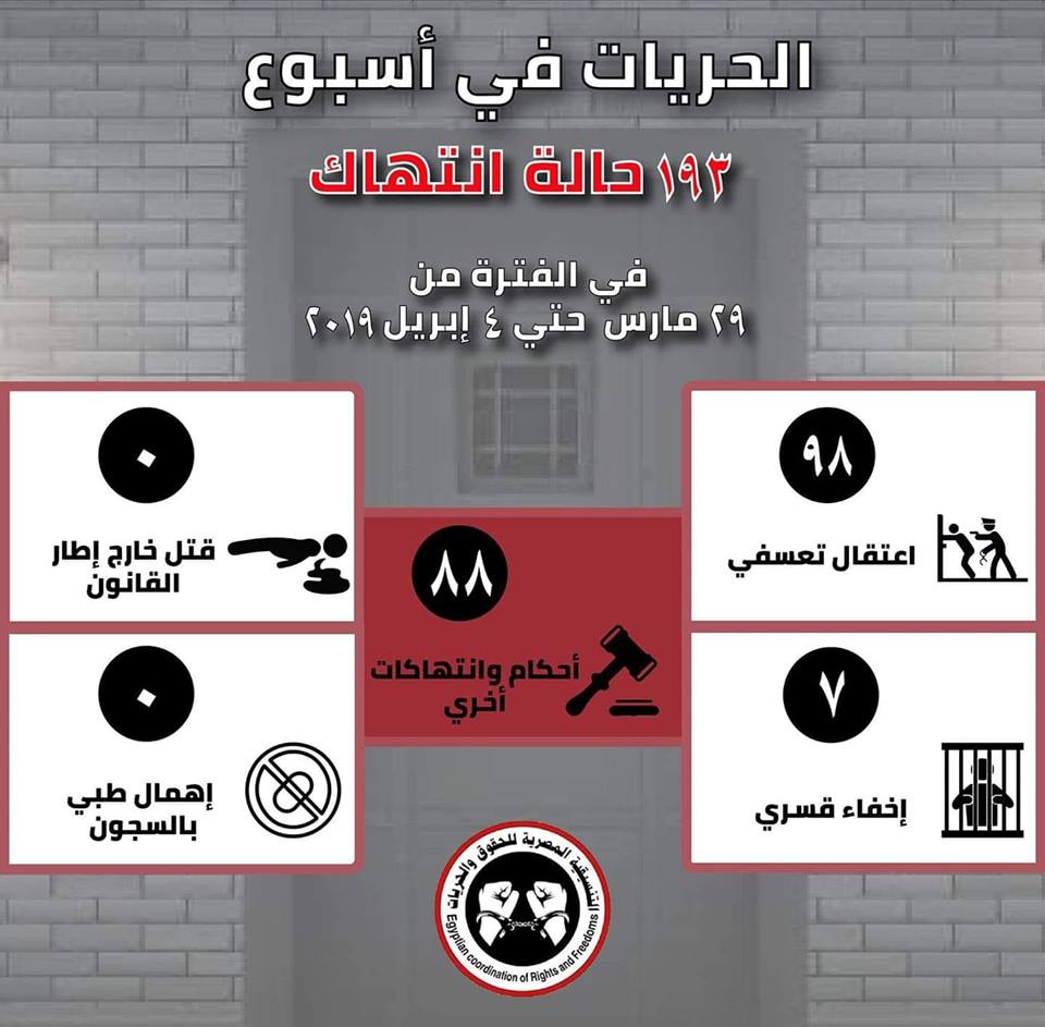 رصدت «التنسيقية المصرية للحقوق والحريات»، خلال الأسبوع الماضي، 193 انتهاكًا لحقوق الإنسان في مصر ارتكبتها ميليشيات العسكر، منذ يوم 29 مارس حتى 4 أبريل 2019 الجاري.