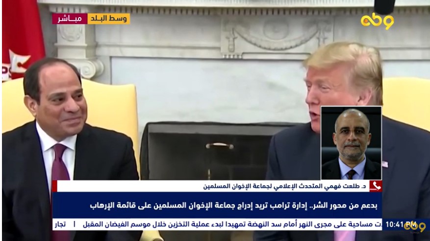 وأوضح فهمي أن السيسي يقدم لهم خدمات جليلة في ساحة الإرهاب العالمي، ويسوق نفسه بوصفه الخادم لمشروعاتهم، وهم يعملون على تلبية بعض متطلباته، ومنها إدراج الإخوان المسلمين كجماعة إرهابية، وهو في الوقت ذاته لا ينفصل عن مزاج ترامب وأجندته الانتخابية وممولي حملته الانتخابية.