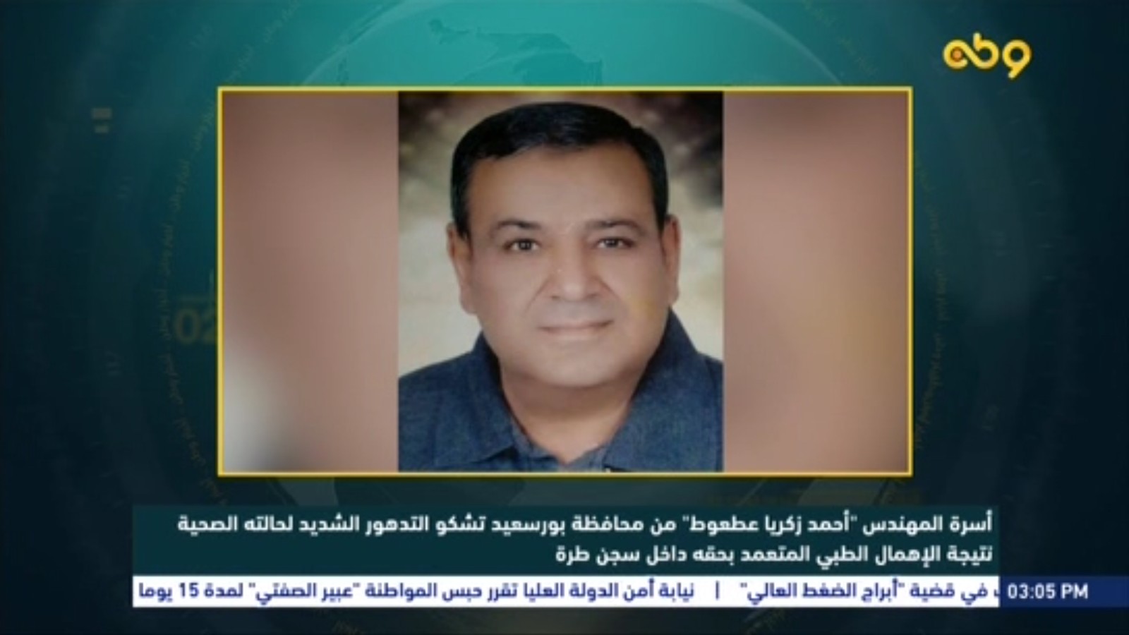 تشكو أسرة المهندس أحمد زكريا عطعوط التدهور الشديد لحالته الصحية نتيجة الإهمال الطبي المتعمد بحقه داخل سجن طرة، محملة وزارة الداخلية بحكومة الانقلاب ومصلحة السجون ومأمور سجن طرة المسؤولية عن سلامته.