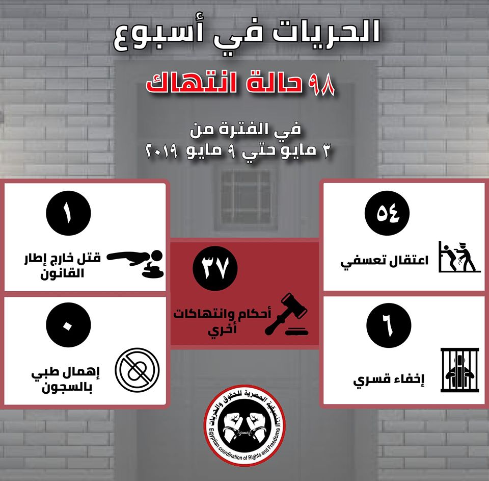 ورصدت “التنسيقية المصرية للحقوق والحريات” خلال الأسبوع الماضي منذ يوم 3 مايو حتى 9 مايو 2019 نحو 98 انتهاكًا لحقوق الإنسان في مصر بشكل متنوع.