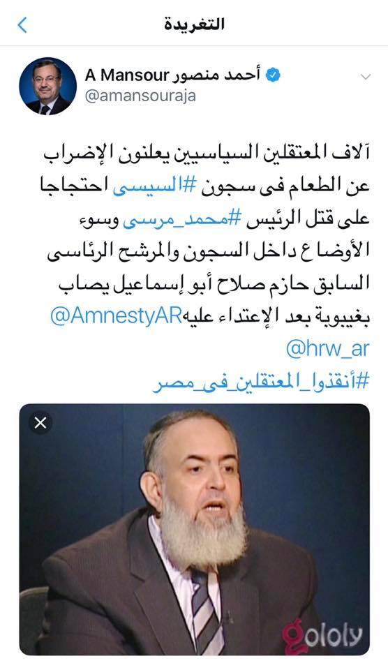 يأتي هذا في الوقت الذي يواصل فيه آلاف المعتقلين إضرابهم عن الطعام، منذ اغتيال الرئيس مرسي، فيما تواصل داخلية الانقلاب منع الزيارة عن المعتقلين بجميع سجون مصر لليوم الخامس على التوالي، وتوقف جلسات المحاكمات، فيما يتم إصدار قرارات النيابات بتجديد الحبس بدون حضور المعتقلين أو محاميهم بدعوى تعذر نقلهم.