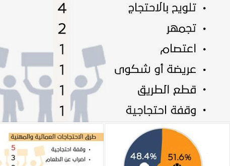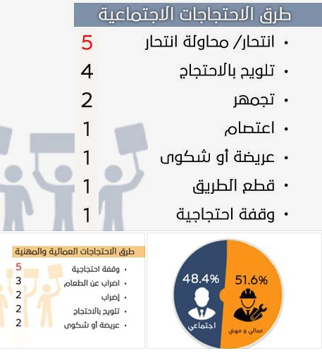 وشملت الاحتجاجات العماليه والمهنية 5 وقفات احتجاجية و3 إضرابات عن الطعام و2 إضراب عن العمل وحالتي تلويح بالإضراب عن العمل يضاف إليها حالتان لجأ فيهما العمال إلى تقديم عريضة أو شكوى كوسيلة من وسائل الاحتجاجات العمالي، فضلا عن حالة لجوء واحدة إلى مكتب العمل وحالة تظاهر واحدة للعمال والمهنيين
