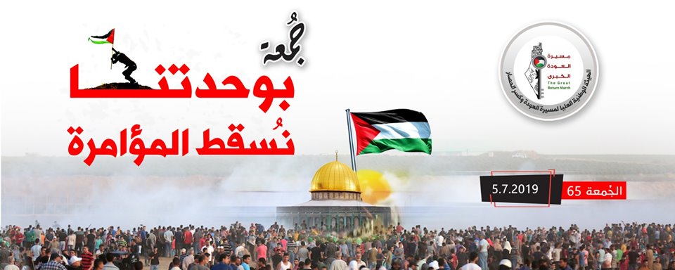 وتنطلق فعاليات جمعة اليوم عقب صلاة العصر مباشرة على أرضِ مخيماتِ العودةِ شرقَ قطاع غزة، حيث دعت الهيئة إلى الحشد والمشاركة من الجميع قائلة: يا حماة الأرض ويا شعلة الثورة، يا من جرعتم عدوكم كأسًا مُرًا، أنتم أيها الأحرار في هذه الأرض المباركة تستنفركم الهيئة الوطنية العليا لمسيرات العودة وكسر الحصار للحشد والمشاركة في جمعة "بوحدتنا نسقط المؤامرة"، وذلك على أرض مخيمات العودة المنتشرة شرق القطاع، بعد عصر يوم الجمعة الخامس من يوليو 2019".