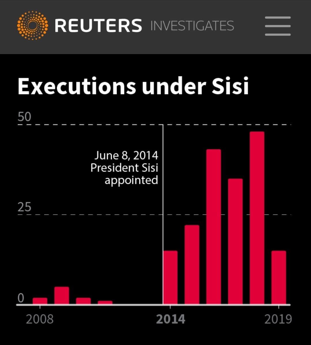 وأكدت دراسة قام بها فريق رويترز للتحقيقات باللغة الإنجليزية أنهم رصدوا قتل سلطة الانقلاب 179 مصريا بأحكام إعدام، من بين 3 آلاف حكم بالإعدام صدرت منذ اغتصاب السيسي الرئاسة عام 2014 حتى 2019، وأن 61 مصريا ينتظرون تنفيذ أحكام بالإعدام أغلبهم من المسجونين السياسيين.