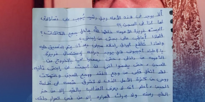 وكتبت “أم زبيدة” تقول:” ألا يوجد في هذه الأمة رجل رشيد يُجيب على تساؤلاتي لم أنا في السجن؟ أليست غريزة الأمومة خلقها الله بداخل جميع الكائنات؟ فلماذا أُعاقب على بحثي عن ابنتي؟ ولماذا تقطع أوراق إخلاء سبيلي بعد أن يتم التصديق عليه”.