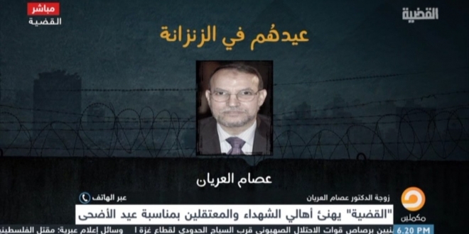 وقالت زوجة العريان إن إدارة سجن العقرب تمنع أسرته من الزيارة منذ أكثر من 3 سنوات ولا تستطيع الأسرة رؤيته إلا من خلف الحائط الزجاجي أثناء المحاكمات ويتم التواصل بالإشارة معه، مضيفة أنه يؤكد لهم باستمرار ثباته وصموده على الحق وأنهم في رعاية الله.
