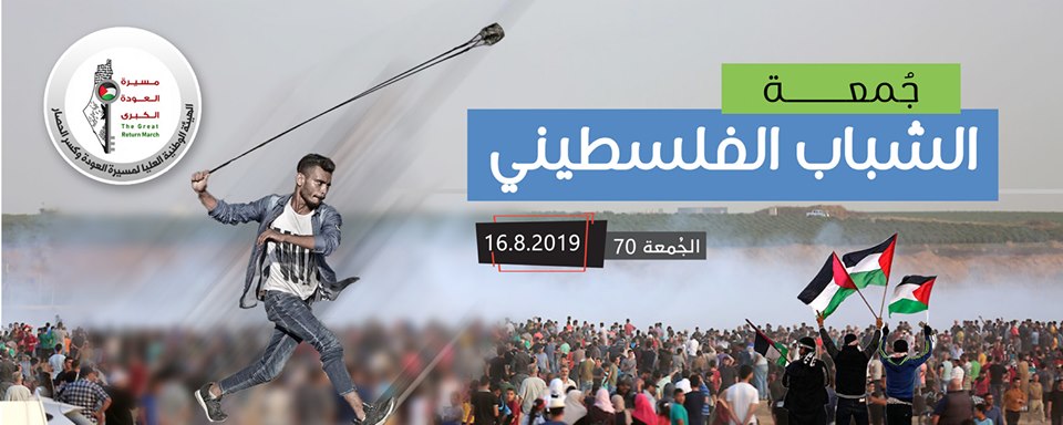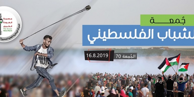 تتواصل اليوم فعاليات مسيرات العودة الشعبية في الجمعة السبعين بعنوان جمعة "الشباب الفلسطيني"؛ تزامنًا مع يوم الشباب العالمي، وللتعبير عن رفض الشعب الفلسطيني للمؤامرة التي تتعرض لها القضية الوطنية وللحصار الظالم على القطاع الصامد.