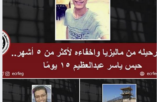 قررت نيابة أمن الانقلاب حبس المعتقل ياسر محمد عبدالعظيم 15 يومًا على ذمة التحقيقات، فيما لفقت له اتهامات ومزاعم بعد ترحيله من ماليزيا وإخفائه أكثر من 5 أشهر.