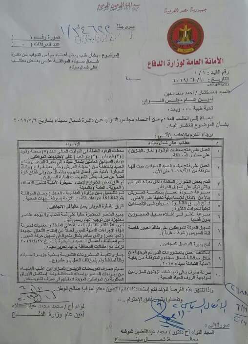 وتحمل الوثيقة ردود قادة جيش الانقلاب علي أعضاء برلمان الانقلاب من أبناء سيناء بشأن مشكلات المحافظة ، وتشمل عشر طلبات متنوعة لنواب شمال سيناء ورد وزارة الدفاع عليها، حيث يرفض جيش الانقلاب طلب لفتح محطات وقود إضافية بالمحافظة بدعوي أن "محطات الوقود العاملة في التوقيت الحالي، وعددها 5 محطات، كافية لاحتياجات المواطنين"، كما يرفض طلبا بفتح ميناء الصيد للصيادين بعد إغلاقه منذ فبراير من العام الماضي حتى الآن، بدعوي أنه "تم نقل الصيادين العاملين في شمال سيناء إلى بحيرة البردويل ومنع الصيد بالمنطقة من مدينة العريش وحتى مدينة رفح، وذلك بهدف تحقيق السيطرة الأمنية على أعمال التهريب والتسلل من وإلى قطاع غزة".
