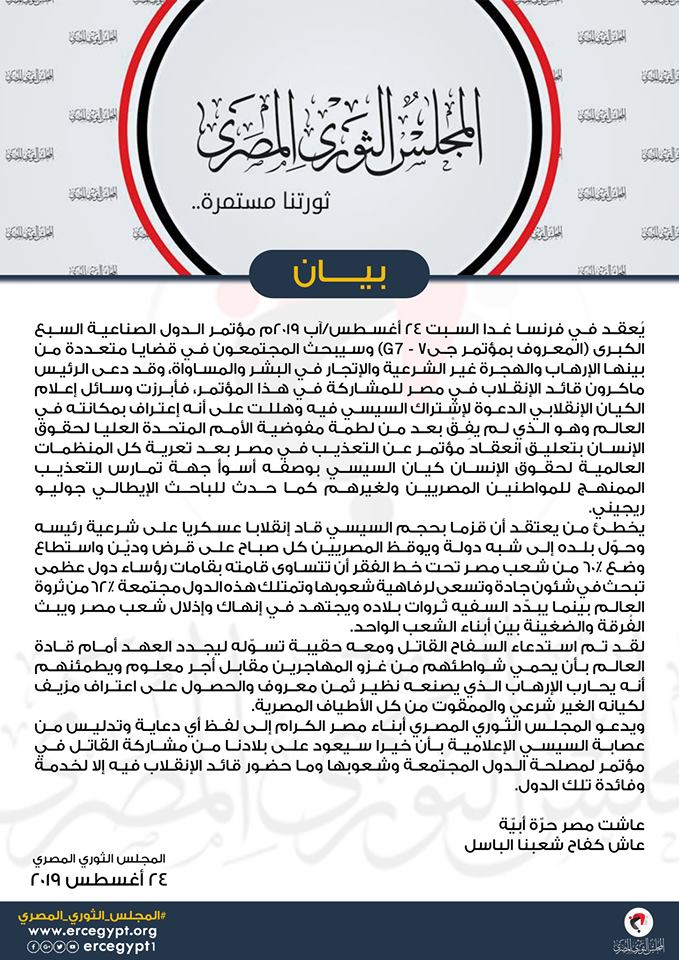 وقال المجلس، في بيان له: “يُعقد في فرنسا اليوم السبت ٢٤ أغسطس ٢٠١٩ مؤتمر الدول الصناعية السبع الكبرى (المعروف بمؤتمر جى٧ – G7) وسيبحث المجتمعون في قضايا متعددة من بينها الإرهاب و الهجرة غير الشرعية والإتجار في البشر والمساواة، وقد دعا الرئيس ماكرون قائد الانقلاب في مصر للمشاركة في هذا المؤتمر، فأبرزت وسائل إعلام الكيان الانقلابي الدعوة لاشتراك السيسي فيه وهللت على أنه اعتراف بمكانته في العالم وهو الذي لم يفِقْ بعد من لطمة مفوضية الأمم المتحدة العليا لحقوق الإنسان بتعليق انعقاد مؤتمر عن التعذيب في مصر بعد تعرية كل المنظمات العالمية لحقوق الإنسان كيان السيسي بوصفه أسوأ جهة تمارس التعذيب الممنهج للمواطنين المصريين ولغيرهم كما حدث للباحث الإيطالي جوليو ريجيني”.