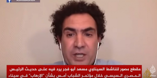 وقال أبو فجر، في فيديو تم تداوله على مواقع التواصل الاجتماعي: "إن السيسي يستعين بأشخاص سوابق في عمليات الجيش في سيناء ويتاجر بمحاربة الإرهاب هناك، ويترك الجنود الغلابة عرضة للقتل بشكل يومي بالعشرات"، متهما السيسي بتنفيذ خطة لترحيل أهالي سيناء ضمن الخطة الأمريكية؛ مؤكدا أن مخططات السيسي ستفشل ولن يسمح بها أهالي سيناء.