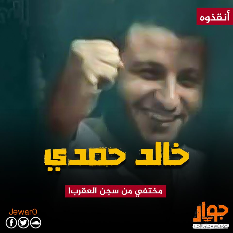 إلى ذلك أطلقت أسرة “خالد حمدي رضوان”، المعتقل في سجن العقرب منذ 27 مارس 2014، حيث يقضي حكمًا جائرًا ومسيسًا بحبسه 15 عامًا، استغاثة للكشف عن مكانه بعد اختطافه من داخل السجن لجهة غير معلومة.