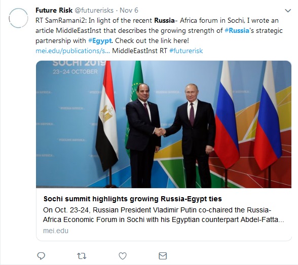 واهتم المعهد الامريكي بالمنتدى الاقتصادي الإفريقي الروسي في سوتشي، في الفترة من 23 إلى 24 أكتوبر، حيث ترأس الرئيس الروسي “فلاديمير بوتين” والسيسي القمة التي شهدت حضور 43 رئيس دولة إفريقية إلى المنتجع على البحر الأسود، شدد “السيسي” على أهمية تعزيز شراكة مصر مع روسيا، ووصف “بوتين” مصر بأنها “ركيزة للأمن والاستقرار في الشرق الأوسط وإفريقيا”.