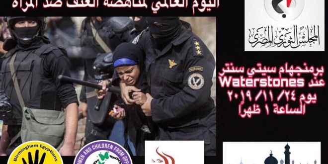 تشهد اليوم مدينة برمنجهام بإنجلترا وقفة احتجاجية رفضًا لجرائم العسكر المتصاعدة في مصر، قبيل يوم واحد من اليوم العالمي لمناهضة العنف ضد المرأة؛ للمطالبة بوقف انتهاكات حقوق الإنسان، وإطلاق الحريات والعودة للمسار الديمقراطي؛ استمرارًا لحراك المصريين في الخارج المناهض للنظام الانقلابي في مصر.