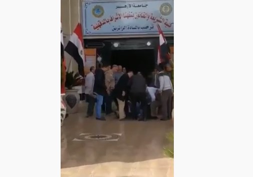 ويُظهر مقطع الفيديو عميد كلية الشريعة والقانون بتفهنا الأشراف وعددًا من رجال الأمن بالجامعة وهم يعتدون بالضرب على طالب بسبب تأخره عن موعد الامتحان.
