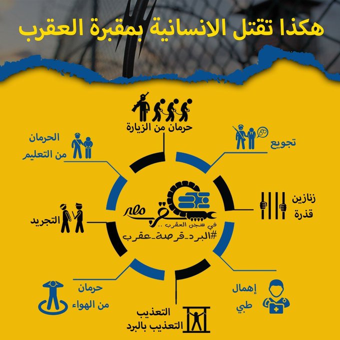 وقال حساب “akh007” وحساب “صوت الزنزانة”: “معتقلي العقرب يتعرضون لعدة انتهاكات منها الحرمان من الزيارة، التجويع، الإهمال الطبي، زنازين قذرة، الحرمان من الهواء، التعذيب.. وفي هذا الشتاء يتحول البرد إلى سلاح في يد النظام يقتلون به المعتقلين في السجن العقرب!!.