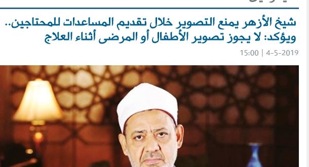 ووجَّه الطيب بمنع التصوير أثناء تقديم المساعدات أو تقديم الزكاة أو الصدقات أو الخدمات للمستحقين، من بيت “الزكاة والصدقات” المصري التابع للأزهر الشريف.