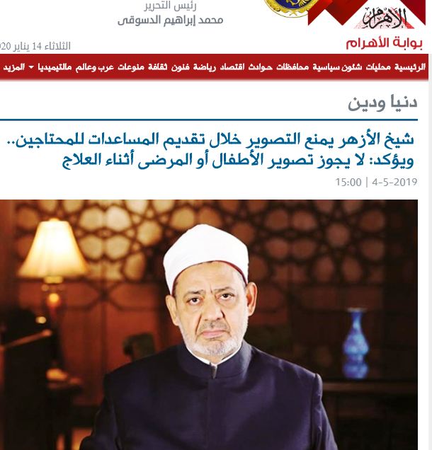 ونشرت صحيفة الانقلاب “الأهرام”، في 4 مايو الماضي، قرار الدكتور أحمد الطيب، شيخ الأزهر”، بتعليمات واضحة وصريحة للحفاظ على كرامة مستحقي الزكاة أثناء تلقيهم حقهم من الزكاة وعدم تصويرهم بأي وسيلة كانت.