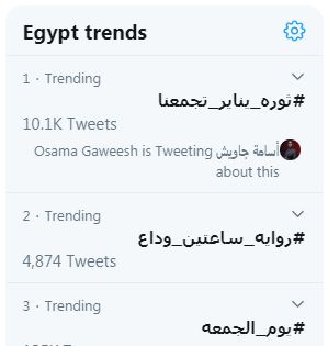 تصدر، اليوم الجمعة 24 يناير 2020، هاشتاج #ثوره_يناير_تجمعنا، مؤكدًا أنه رغم مرور 9 سنوات على الثورة إلا أنها لا تزال مشتعلة في النفوس، والشعب ما زال يريد إسقاط النظام، وما زال السيسي يُكابر ويستعطف، وما زال شعار "يناير يجمعنا" هو الهاجس الذي يحرك شباب مصر الرافضين للذل والخنوع.