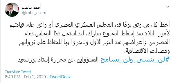 وقال، فى تدوينة له عبر حسابه على تويتر، بمناسبة ذكرى مجزرة استاد بورسعيد: “إن الشعب المصري لن ينسى اليوم الدامي في تاريخ مصر”.
