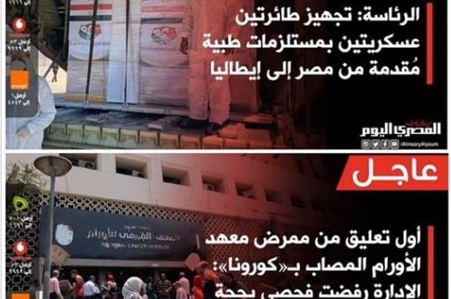 أما أحمد شعراوي فكتب: "وزيرة الصحة تصل إلى إيطاليا بمستلزمات طبية من مصر بعد توجيه من السيسي بإرسال طائرتين عسكريتين كمساعدات لها، في حين أن العالم بيتخانق على المستلزمات الطبية، وفي حين أن في مستشفيات مصرية تعاني من النقص من المستلزمات.. لكن واضح السيسي بيعالج قضية ريجيني على دم الشعب المصري".