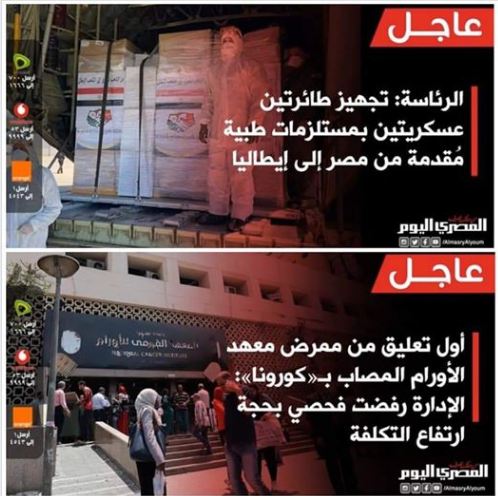 وكتب المحامي عمرو عبد الهادي: "إلى المصريين إلى مش لاقيين كمامات اليوم #السيسي أرسل شحنتين تانيين إلى ايطاليا لإغاثتهم في #كورونا رغم أن أطباء معهد الأورام رفض الجيش يحلل لهم.. وفلوسنا لإيطاليا عشان يتقفل موضوع قتل محمود السيسي للطالب ريجيني.. سيبكم إن الوزيرة ووفدها مش لابسين كمامات إنما شوفوا فلوسكم بتروح فين".