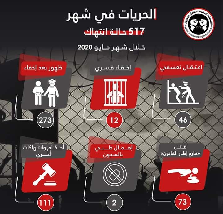 وذكرت أن مجموع الانتهاكات التى رصدتها المنظمة، خلال شهر مايو 2020، وصلت إلى نحو 517 حالة انتهاك لحقوق الإنسان في مصر.