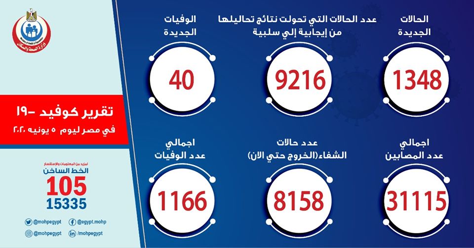 فعلى الصعيد المحلي، أعلنت وزارة الصحة في حكومة الانقلاب عن ارتفاع عدد المصابين بفيروس كورونا المستجد، حتى اليوم الجمعة، إلى 31115 حالة بعد تسجيل 1348 إصابة جديدة، وارتفاع عدد الوفيات إلى 1166 حالة وفاة بعد تسجيل 40 وفاة جديدة.
