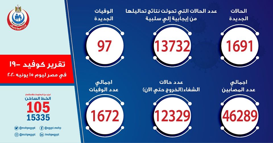 أعلنت وزارة الصحة في حكومة الانقلاب عن ارتفاع إجمالي المصابين بفيروس كورونا المستجد، حتى اليوم الاثنين، إلى 46289 حالة بعد تسجيل 1691 حالة إصابة جديدة، وارتفاع عدد الوفيات إلى 1672 حالة وفاة بعد تسجيل 97 حالة وفاة جديدة.