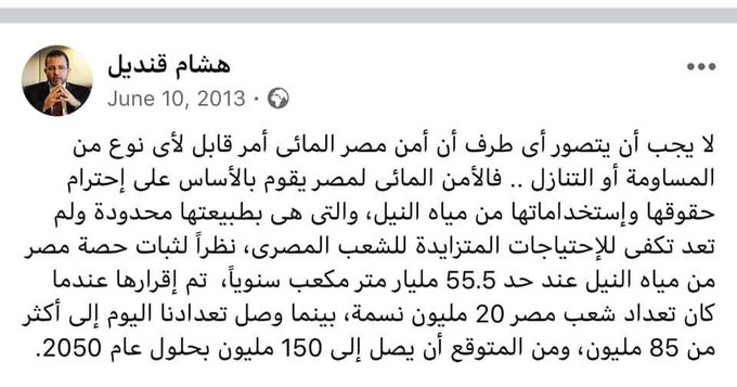 وأضاف في تدوينة أخرى: "الدكتور هشام قنديل كان حريصا على مصلحة مصر ومن كان يدير الملف هي الأجهزة السيادية، وبلاش عبط.. أي وزير ري لا علاقة له بقرارات سد النهضة ومحاولة البحث عمن يشيل الليلة بعد فشل الخاين السيسي فهو دليل على أن من يحكم مصر عميل.. الملف كان تحت ايده من ٣ يوليو ٢٠١٣، وجاي دلوقتي يبحث عن كبش فداء".