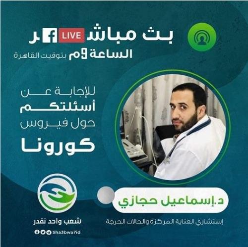 كما استكملت “شعب واحد نقدر” مبادرة “#مستشفى_أون_لاين”، وأمس الأربعاء التقى الدكتور مصطفى أحمد، استشاري الباطنة، مع نحو 1800 متابع، واليوم الخميس يلتقي متابعو البث المباشر مع الدكتور إسماعيل حجازي، استشاري الحالات الحرجة والعناية المركزة، للإجابة عن أسئلة المتابعين واستفساراتهم.