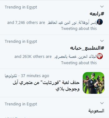 منذ الساعات الأولى من صباح الجمعة وحتى الآن يتصدر هاشتاج #رابعة قمة التداول في مصر، وأضيف له عصرا بقوة هاشتاج #رابعة_جريمة_ضد_الانسانية ووسوم أخرى، منها #لن_ننسى_رابعة و#رابعة_الصمود وغيرها؛ تضامنا مع حق شهداء قتلوا بدم بارد خائن مضى عليه 7 سنوات، يأكل الانقلابيون ويتمتعون كما البهائم، غير مهتمين بما سال بل ويمعنون الأذى بأهل رابعة ومن ناصرهم.