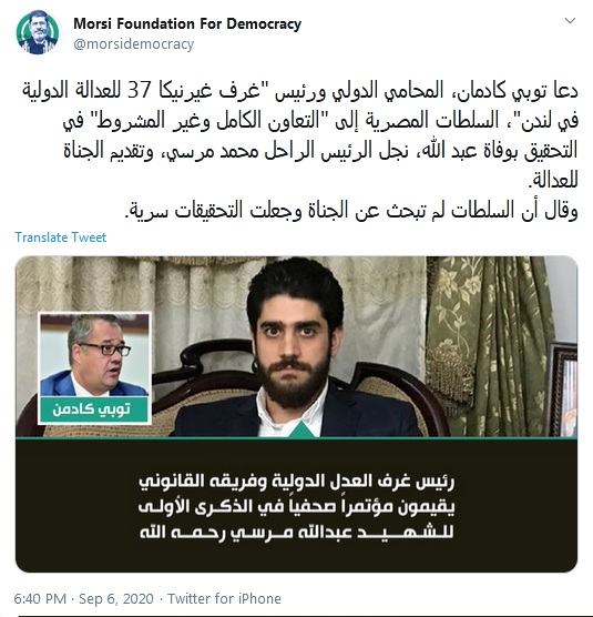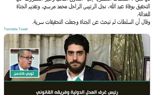 دعا المحامي البريطاني توبي كادمان، رئيس غرف غيرنيكا 37 للعدالة الدولية في لندن، المقررة الخاصة للأمم المتحدة، الدكتورة أجنيس كالامارد، إلى الضغط للتحقيق في بيان لمؤسسته القانونية أكد مقتل عبدالله مرسي بحقنة قتلة بعدما قتل والده الرئيس الشهيد محمد مرسي بغدر من العسكر.