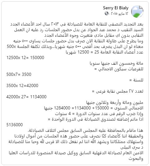 وفي 12 مايو 2015، كتب "البيلي" صفحة من جهود نقابيي الإخوان وهو منهم فأشار إلى أنه "بعد التجديد النصفى للنقابة العامة للصيادلة فى ٢٠١٣ سأل أحد الأعضاء الجدد النقيب د. محمد عبد الجواد عن بدل حضور الجلسات رد عليه أن العمل النقابي بدون أي مقابل مادي فتغيرت وجوه الأعضاء الجدد".