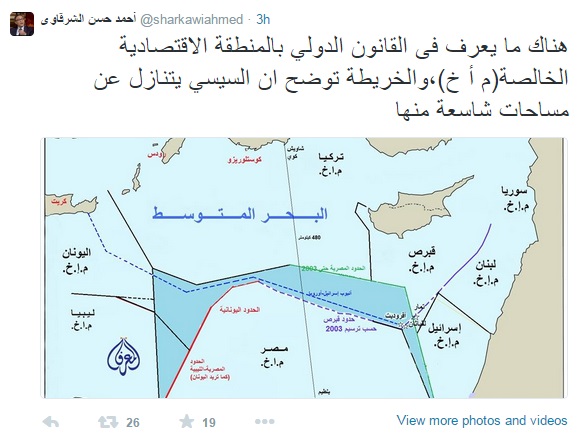 وأضاف أن هناك ما يعرف فى القانون الدولي بالمنطقة الاقتصادية الخالصة (م أ خ)، والخريطة توضح أن السيسي يتنازل عن مساحات شاسعة منها، فى المتوسط لليونان، وآبار الغاز لقبرص واسرائيل مقابل دعم نظامه غير الشرعي، يبقي خاين.
