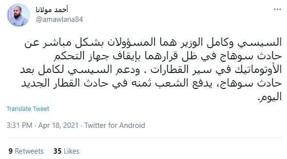 أما حساب ثورة الغلابة جاية @lotfyman فكتبت: "الغريب في الأمر أن #قناة_الجزيرة تسبق قنوات الريادة الإعلامية العربية المنشغلة بالمسلسلات #حادث_قطار_طوخ.. شيء محزن من النظام الذي يفقد أرواح المصريين بسببه".