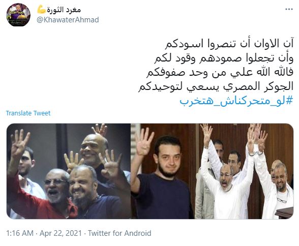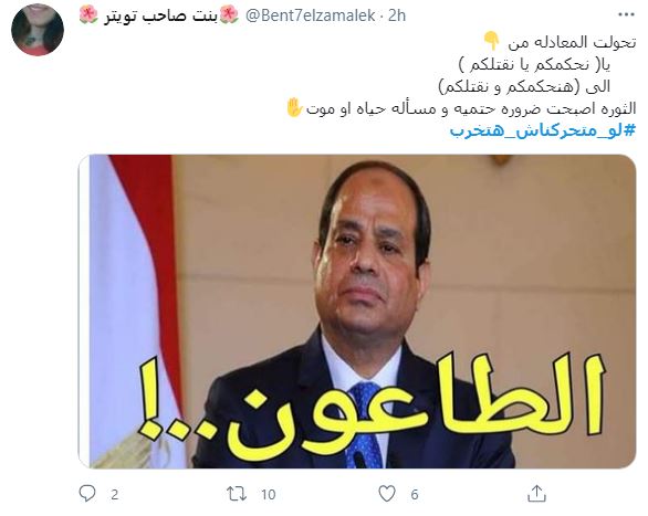 وكتب الطاير @Altayya67499401: "لازم نجمع يا أحرار قبل فوات الأوان.. والله لو فضلنا كذا لانبقي عبيد زي أيام فرعون أو اكثر.. ما حدش يخاف ولما ننزل مش هنسيب واحد يتاخذ مننا مصر.. في عز حاجتها لينا لبوا النداء #لو_متحركناش_هتخرب".
