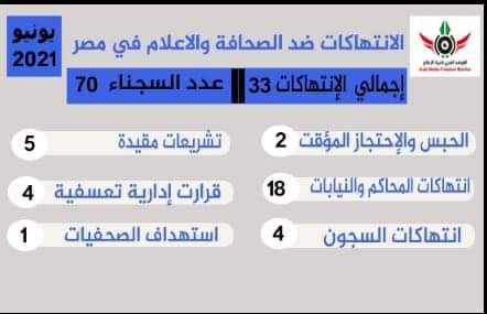 ووثق المرصد في تقريره عن انتهاكات حرية الإعلام في مصر خلال شهر يونيو 2021 العديد من الانتهاكات بلغت 33 انتهاكا متنوعا ، فضلا عن استمرار حبس 70 صحفيا.