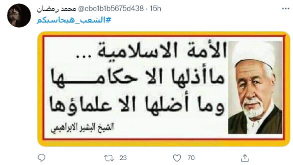 وتساءل وضوح @Eriel_224: "هو فين الشعب اللي هيحاسب؟؟ هذا سؤال يدل على قنوط في النفس وتخذيل للغير .. من يفعل ذلك ويقوله هو عبء على أي تقدم للثورة .. دع الذين يرجون وعد الله يعملون .. واقعد أنت بعيدا مع يأسك من نصر الله".