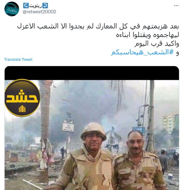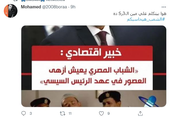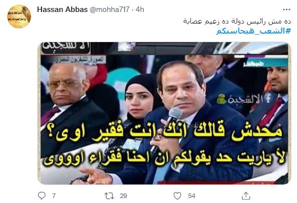 وقال حساب عابر سبيل المصرى @h5LGR1eAoN8GtxZ "وبيحكمها صهيونى وراه إعلامه ومعيزه.. وعبيد شيوخ سلطان بتهوى له على عايزه.. شافوا الظلم والإجرام وبتنادى بتعزيزه.. وانت ياحر يامظلوم خايف تطالب بحقك.. خلاص راضي كدا بالظلم وكاتم حزنك بقلبك.. سايبهم ينهشوا لحمك ويتطاولوا على عرضك.. ودول قتلوا أخوك قبلك وعايشين فيها على دمك.. فوقوا".
