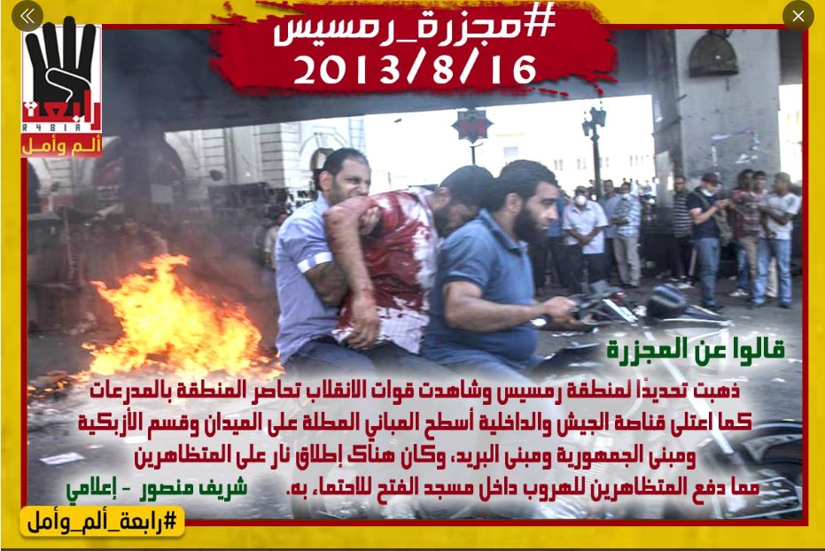 وأشار محمد عبدالعزيز @Msaeerb إلى أن "يوم 16 أغسطس قتلت قوات الانقلاب بوابل من الرصاص الحي والقنص عبر طائرات الهليكوبتر؛ ما أدَّى إلى ارتقاء عدد كبير من الشهداء في ميدان رمسيس استكمالا لمجزرة فض رابعة والنهضة".