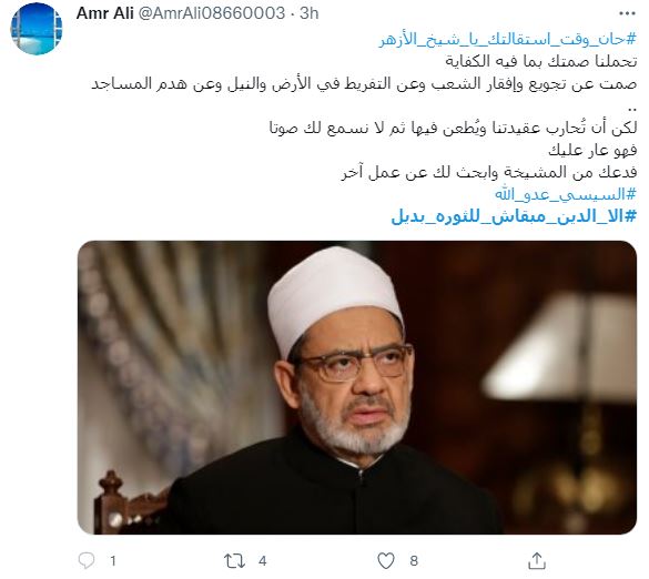وعلق حساب محمد ناصر علي (محاكاة) @3m4710 قائلا "كلما اقترب السيسي واتخذ خطوات ضد الدين يزداد فرحي لأنه بذلك يعجل بنهايته ومن يستطع أن يقف أمام الله؟. #إلا_الدين_مبقاش_للثورة_بديل وسواء تحركنا أم لا فإن الله لن يترك هؤلاء ونحن الرابحون إن كان لنا شرف الدفاع عن ديننا.. لا إله إلا الله محمد رسول الله #السيسي_عدو_الله".