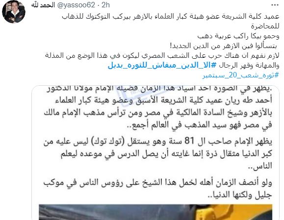 وأضافت الملاك الحزين @Lido8080 "أيها المصري الحر لا تفرط في حريتك ولو كلفك ما كلفك، أنت عبد لله وهم عبيد لغيره لا ترضَ بالفُتات ولا تصفق للباطل ولا تشمت في غيرك ممن يُظلم ويُسحل ويُروع، اليوم هو وغدا أنت، لا تأخذك السكرة وشعارات سحرة فرعون.والله إنها لمنظومة واحدة قبيحة تطل كل مرة برأس.#إلا_الدين_مبقاش_للثورة_بديل".