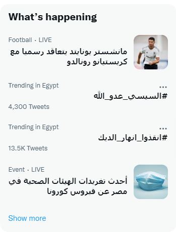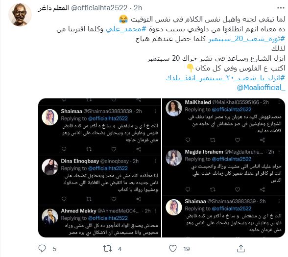 خلال الأيام الماضية تصدرت هاشتاجات #ثورة_شعب_20_سبتمبر و #إلا_الدين_مبقاش_للثورة_بديل و#السيسي_عدو_الله وذلك بالتزامن مع اقتراب ذكرى 20 سبتمبر 2019، والتي استطاعت فيه قرى مصرية كسر الحظر والخروج ضد سياسيات السيسي وحكومته المهددة للمصريين بزيادة الفقر.