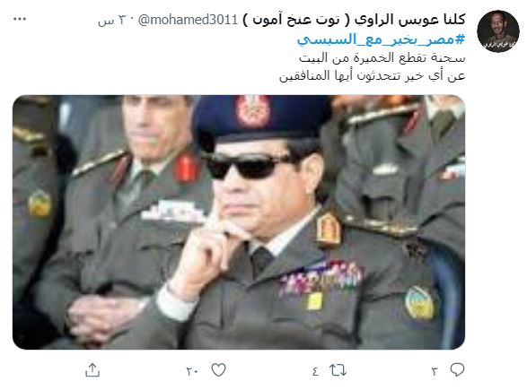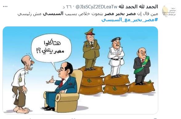 الطريف أن أبرز المنتقدين كان من المخدوعين السابقين بالسيسي وحكم العسكر يقول د.السيد علي @MoMo87427672 "مصر بخير فين بكل بساطة وبعيدا عن العنف الحزبي وشيطنة كل طرف منكم للآخر .. فين الخير والسيد (…) بعد ما انتخبناه خلى عيشتنا طينة أسعار مضروبة في ١٠٠ ضرايب على النفس اللي بنتنفسه لو بتقبضو وتطبلو من حقكم إنما إحنا الشعب خلاص مش عارفين نعيش".