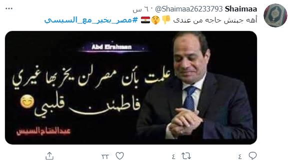 وأضافت آسيا سليم @eIhQ2aDPC5uJbch "#مصر_بخير_مع_السيسي طول مابيعمل ويُقر #إتاوات_للبشوات هتكون مصر بتاعتهم بخير".