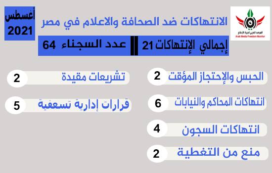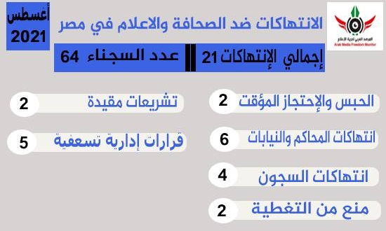 رصد تقرير انتهاكات حرية الصحافة في مصر لشهر أغسطس المنقضي الصادر عن المرصد العربي لحرية الإعلام 21 انتهاكا متنوعا.