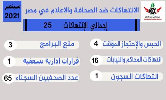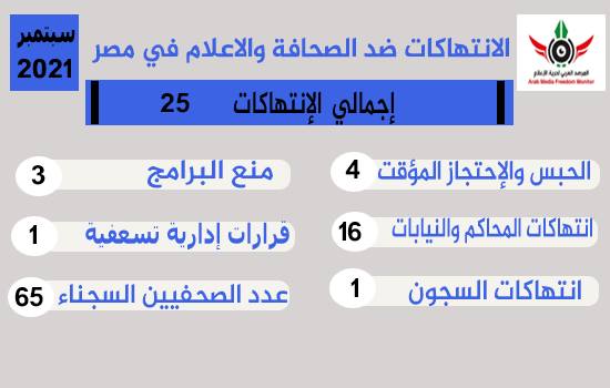 وثق "المرصد العربي لحرية الإعلام" خلال شهر سبتمبر المنقضي 25 انتهاكا ضد الصحافة وحرية الإعلام في مصر بما يؤكد على تواصل واستمرار نهج  نظام السيسي في الانتهاكات لحرية التعبير وحرية الإعلام.