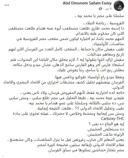 وأضاف أن الشاب (محمد باشا) "تم اختياره ليكون ضمن منتخب مصر للفروسية وفي منافسات الأولمبياد، ورغم أنه لا مكان له فالمنتخب كامل العدد من الفرسان الذين لهم تاريخ ومعهم ميداليات"، تم تخليق مكان له باستبعاد فارس آخر، وهو الفارس سامح الدهان.